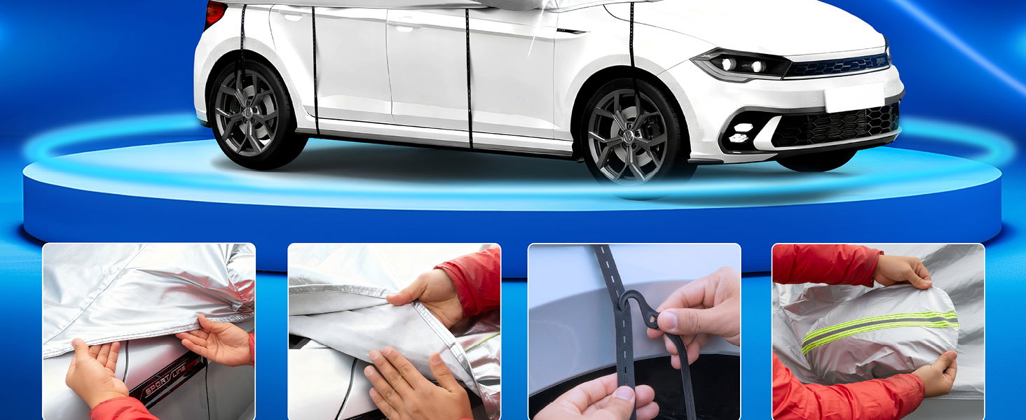 Unsere Autoabdeckplane kann, dank der Gummibänder mit Haken vorne und hinten, mühelos montiert werden. Diese sorgen dafür, dass die Plane sicher auf dem Auto bleibt, ohne davonzuwehen. Verstärkte Haltegurtaufnahmen gewährleisten eine verbesserte Haltbarkeit bei starkem Wind. Für zusätzliche Praktikabilität gibt es seitlich eine Tasche, um das überstehende Befestigungsband sauber zu verstauen. Die mitgelieferte Tasche ermöglicht eine platzsparende Aufbewahrung. Bitte beachten Sie, dass sich bei starkem Regen und schwankenden Temperaturen unter der Abdeckung Kondenswasser bilden kann. Daher ist es ratsam, die Plane regelmäßig zu entfernen, zu lüften und zu trocknen.