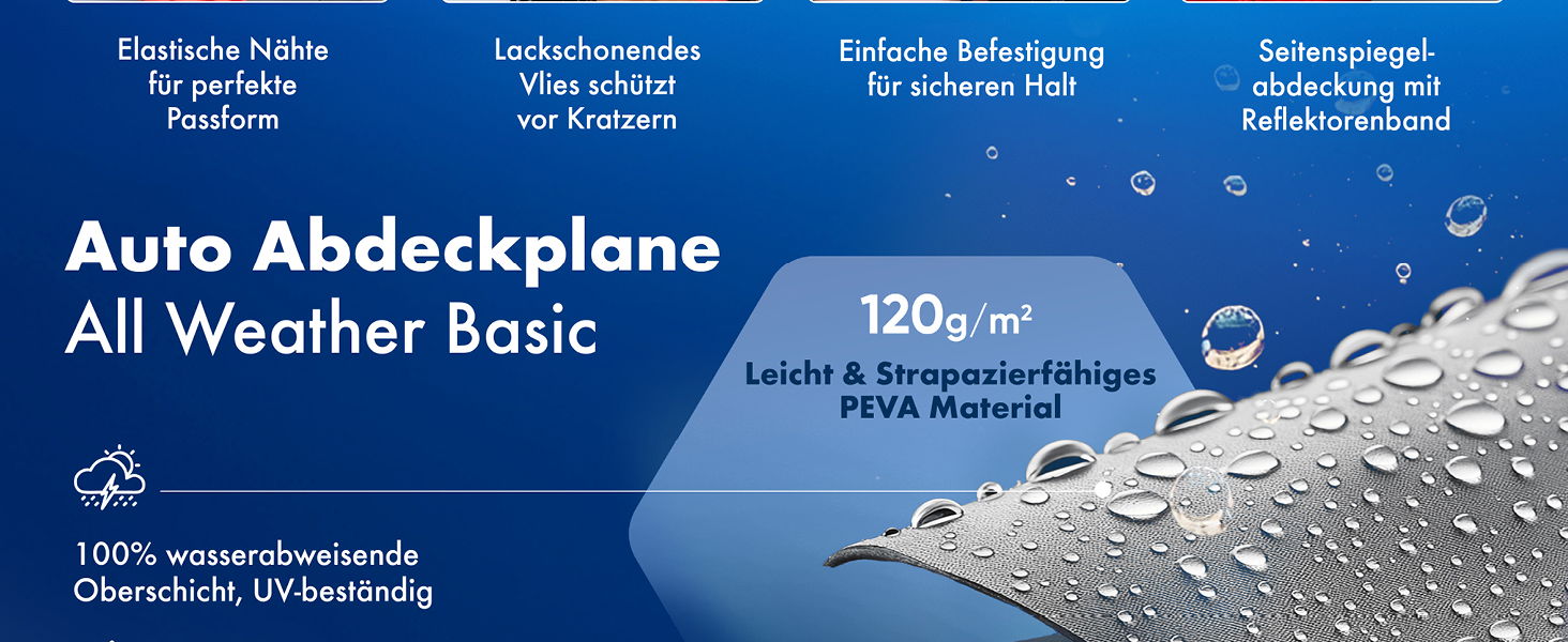 All Weather besteht aus strapazierfähigem 120g/m² PEVA-beschichtetem Faservliesstoff, was sie wasserdicht macht - ein großer Vorteil für den Einsatz im Freien. Dadurch wird Ihr Fahrzeug vor Regen, Eis, Schnee und anderen Verschmutzungen wie Staub, Vogelkot und Laub geschützt. Die Abdeckplane kann auch im Innenraum verwendet werden, wenn Ihr Auto längere Zeit ungenutzt in der Garage steht.